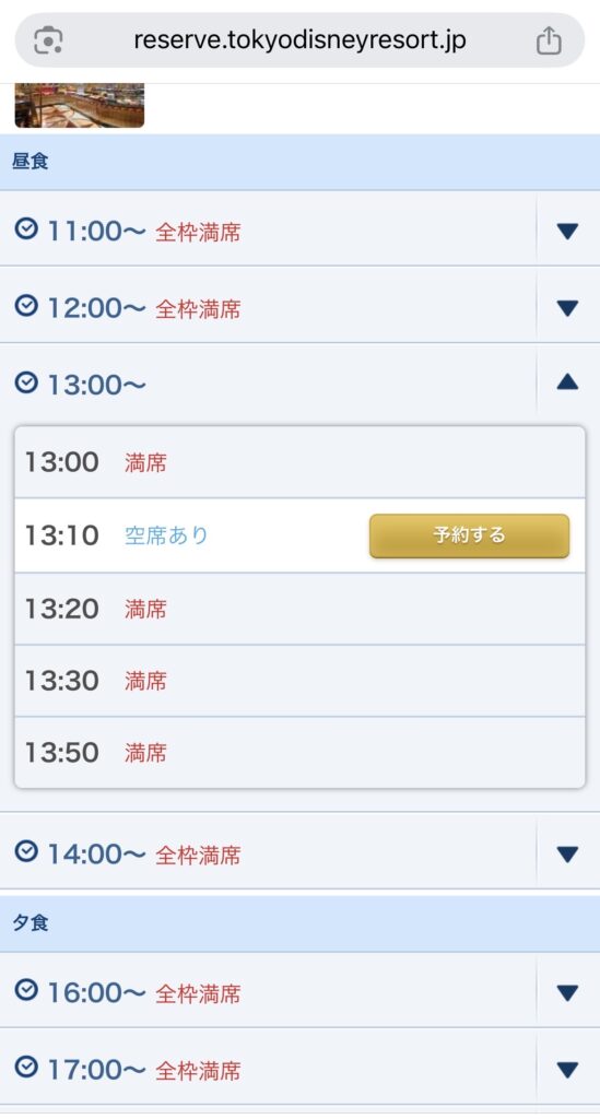 旅行の1か月ほど前にバケーションパッケージをバタバタと取り終えて、次はご飯をどうするか?バケパと合わせてレストランをとる方が確実だけど、少し割高なので今回はアンバサダーホテルに泊まるということもあり、宿泊者特典を使ってみることにした。がしかし、予約画面はすでに「満席🈵」。そりゃそうだよね。1か月前に家族4人でシェフミッキーの予約なんて取れるわけないよねと思っていたら、数日後にふら~っと予約サイトを見てみるとシェフミッキーが13:10~からの枠が空いている!!